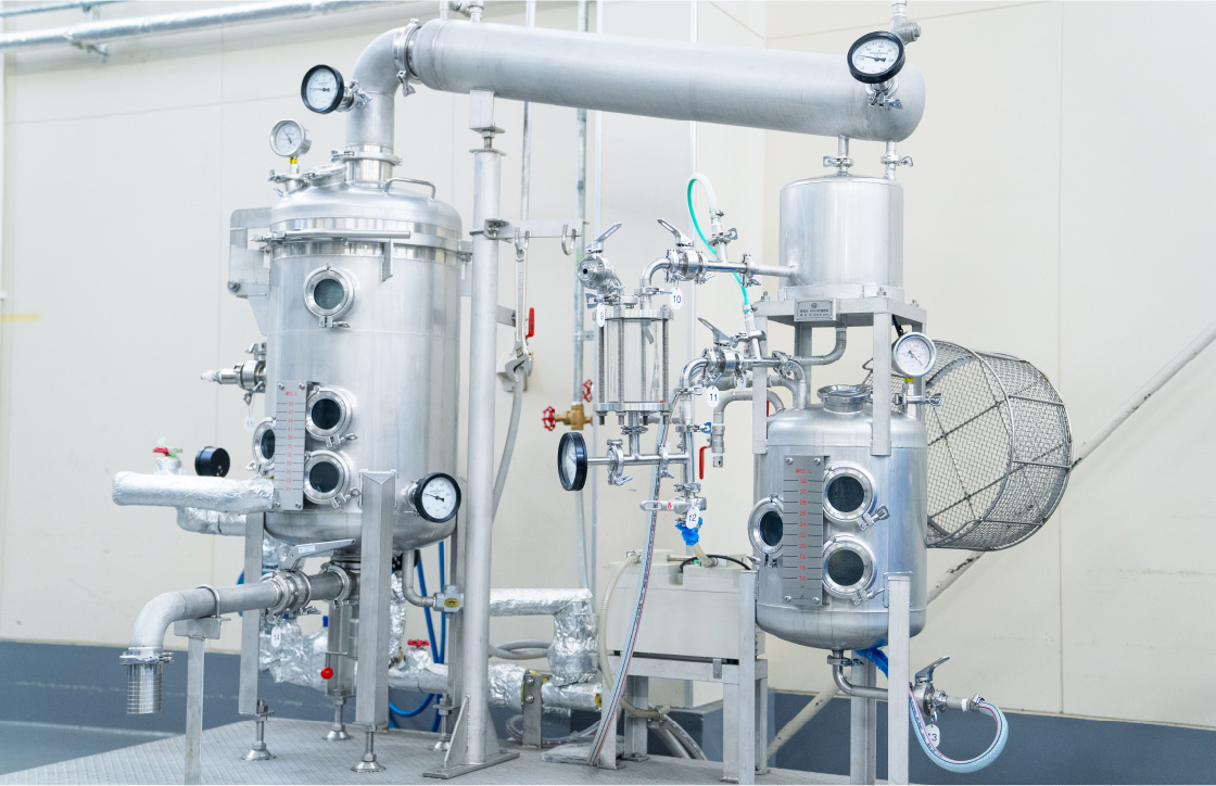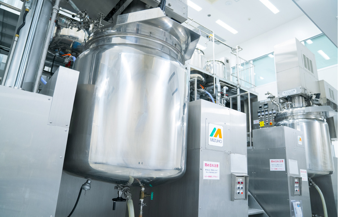 美しい自然環境と共生する仕組みを取り入れた主力製造拠点。北上川の支流から汲み上げた天然水を精製して使用するほか、自社栽培したオーガニック植物を原料とした製品づくりが可能な工場です。最新の機械設備を導入しており、製造過程での省人化を実現。世界基準のエコサート・オーガニックコスメの製造にも対応しています。また、ムスリム市場のハラール化粧品やインドネシア向け製品(BPJPH)づくりも可能です。