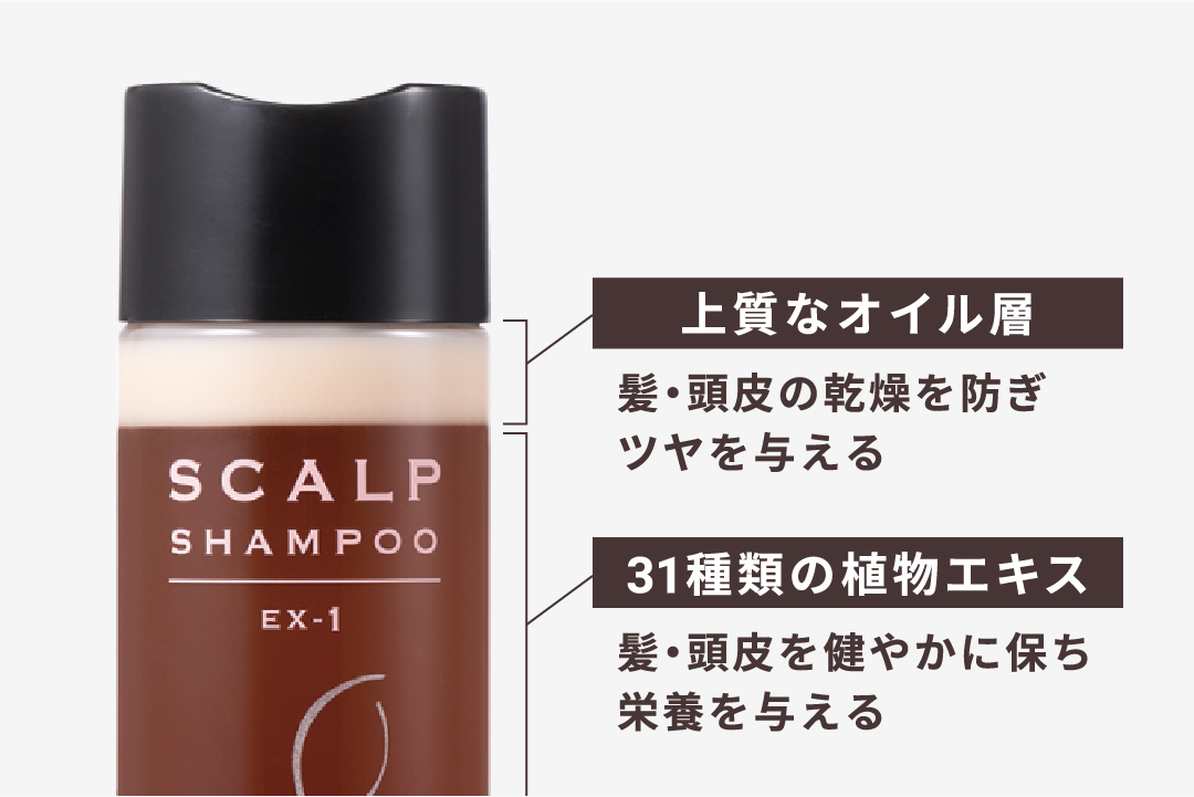 特徴的な2層構造のテクスチャーをシェイクして使うユニークな処方です。髪にツヤを与える「ツバキオイル」や「月見草オイル」を贅沢に配合した上層と、「31種の植物エキス」で頭皮に栄養を与えながら洗える下層の洗浄成分を、よく振って均等に混ぜていただくことで頭髪全体に成分が行き渡り、健やかな頭皮環境に整えて、早いサイクルでツヤのあるロングヘアを叶えます。
