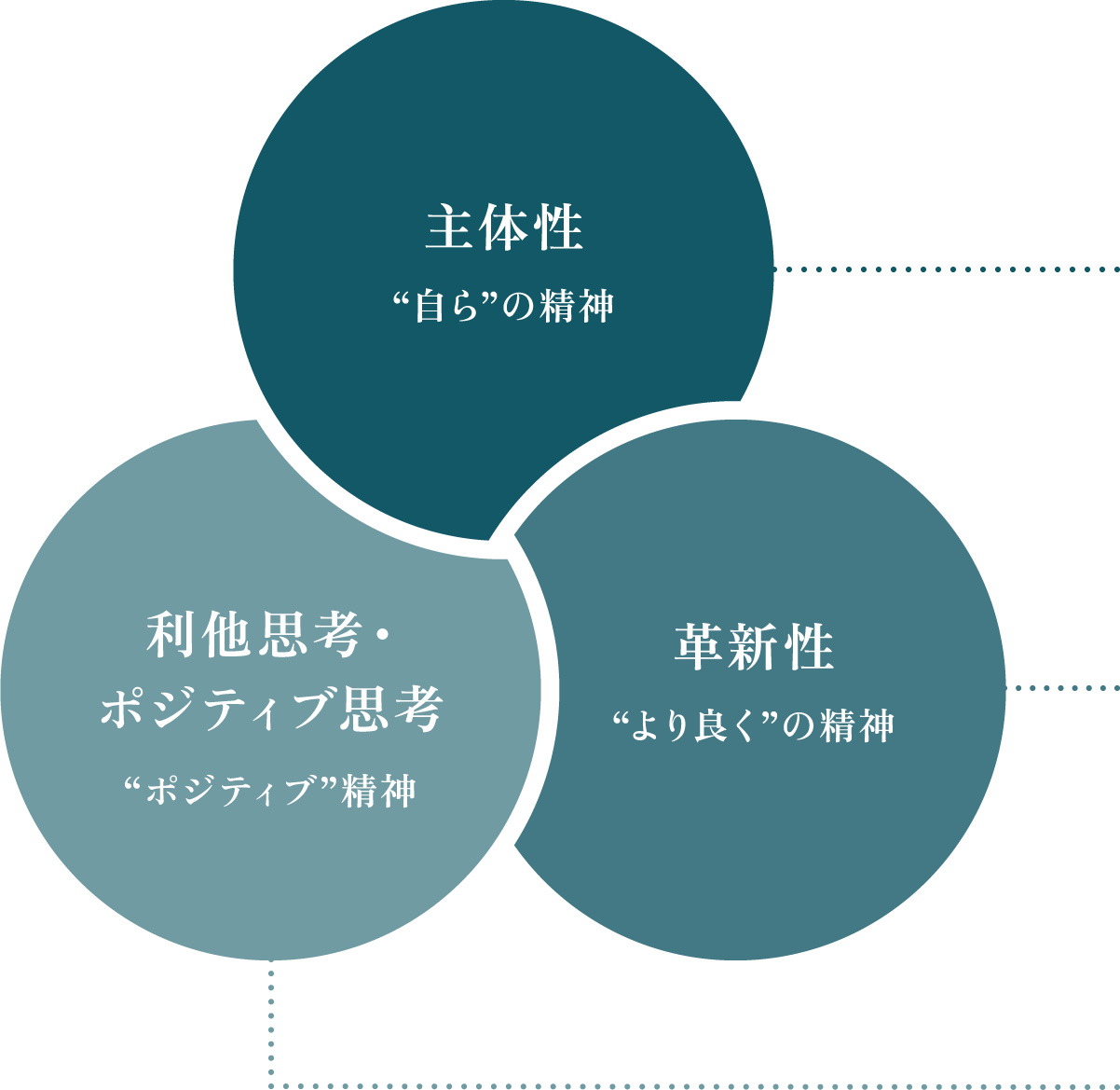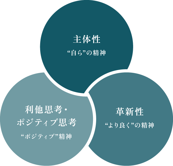 社員は、「主体性」「利他思考・ポジティブ思考」「革新性」の3つを心がけて日々の活動を行っており、