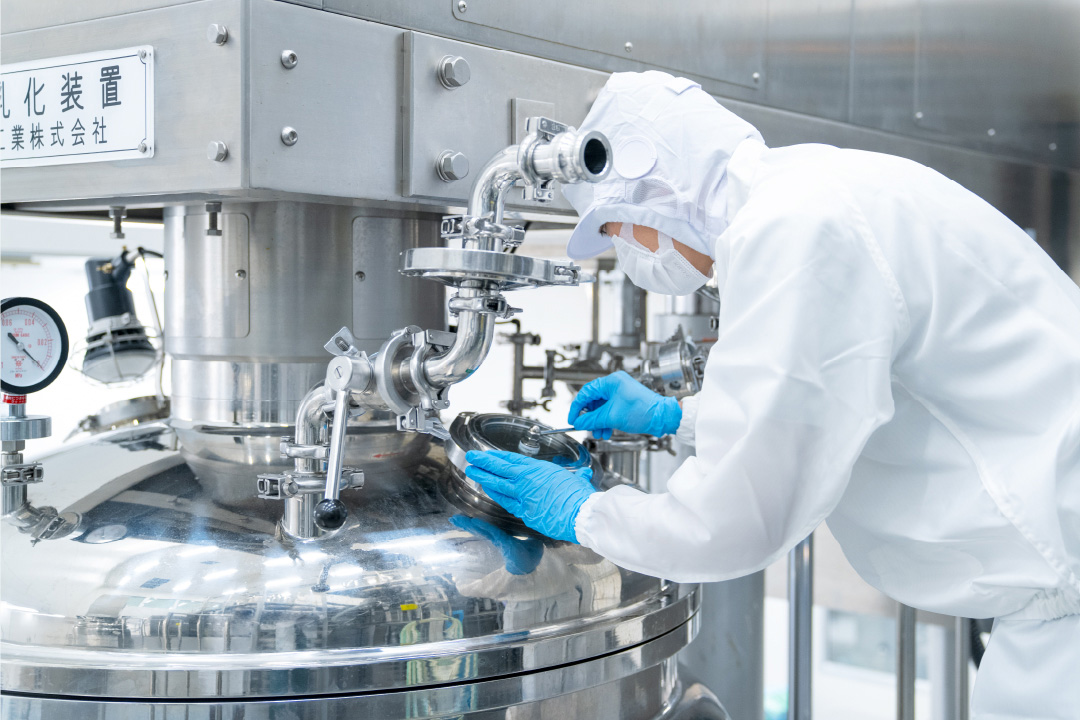容器に入れる「化粧品(内容液)の製造」を行います。当社の商品品質に関わる重要かつやりがいの大きいポジションです。仕事の大まかな流れは、必要な原料の準備から始めていき、機器での計量、各原料の混合、検査、タンクへの移し入れ、といった流れです。